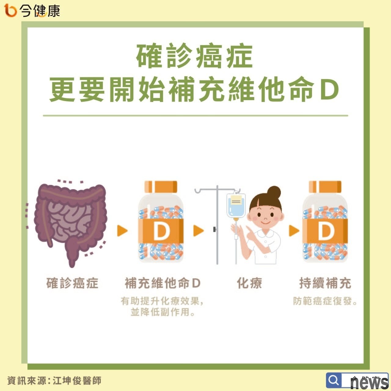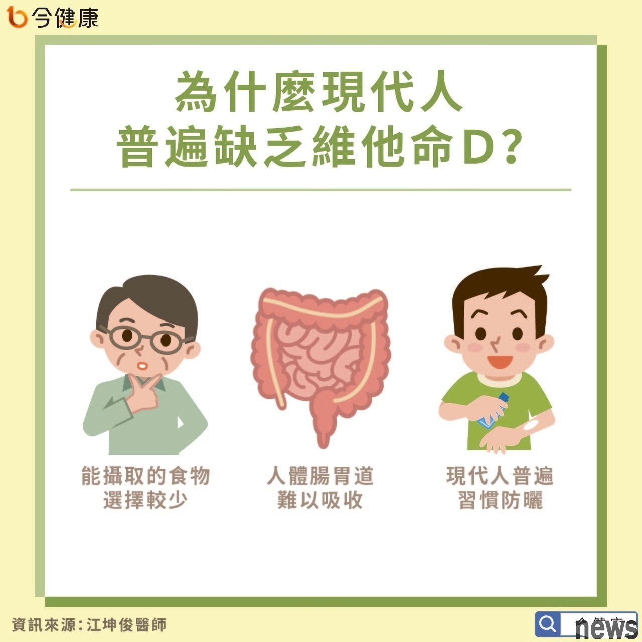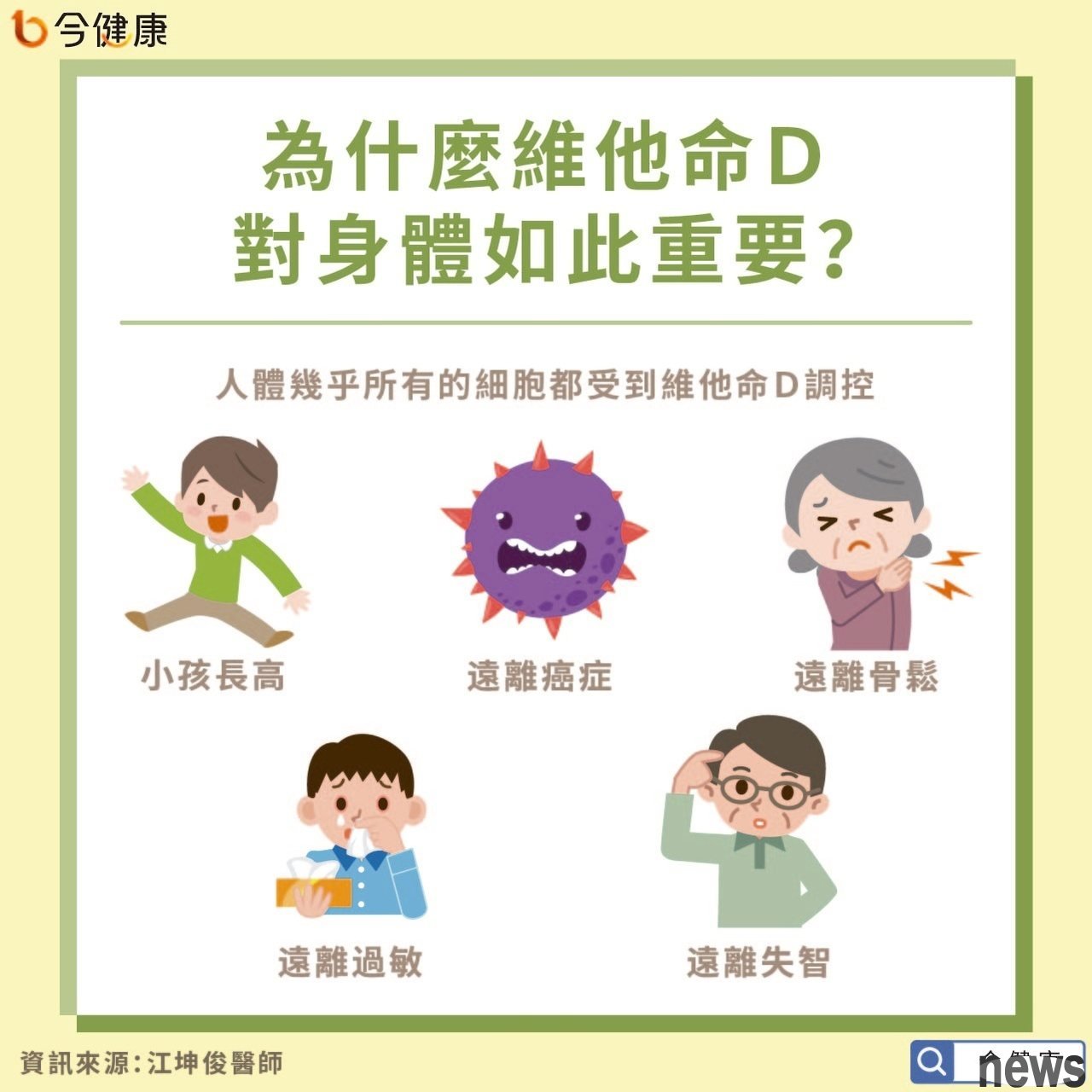 Why is vitamin D so important to the body? Doctor Jiang Kunjun said that vitamin D is one of the most important vitamins for the human body. Almost all cells in the human body are controlled by vitamin D. Replenishing vitamin D can be said to be the highest investment in health for the body. For example, we often hear that if a child wants to grow taller, he must not lack vitamin D; if he wants to prevent bone loss, he must also supplement vitamin D. In addition, if he wants to avoid allergies, cancer, or the risk of dementia of the elderly, vitamin D must also be supplemented to at least normal values. Many studies have also found that the incidence of cancer is inversely proportional to vitamin D in the blood in the body; in other words, the lower the concentration of vitamin D, the higher the chance of cancer, and the worse the patient's prospects.