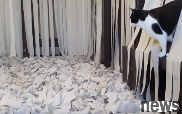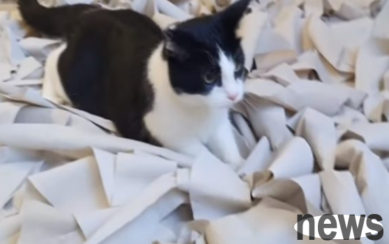 There is a couple in Belarus who met their master more than four years ago at the door of their home. Perhaps many people already know this famous black and white cat, Pusic, who stands up with his hands out for hugs and rings the bell to order food. The couple simply adores him. , often provide various toys to keep Pusic fresh, and recently the couple did the craziest move, which is to cover the living room with toilet paper!