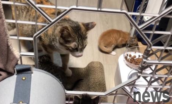 The mother cat was pacing anxiously in the house with the kitten in her mouth. The little brother, who encountered such a scene for the first time, was instantly panicked and a little at a loss.