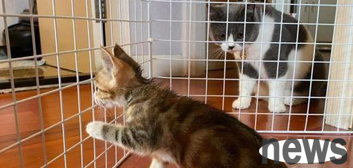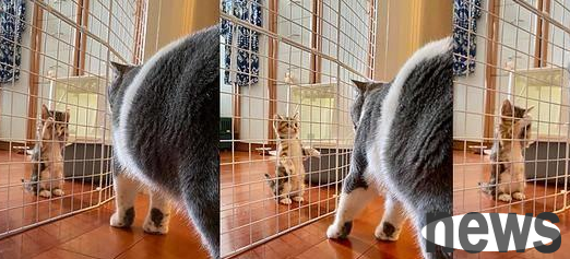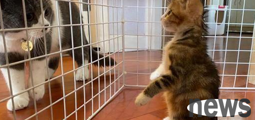 "Brother" Bobby is very big-headed and wants to communicate with his "new friends" up close. However, the shovel officer is afraid that they will fight, so he temporarily separates them with a wire fence. "Brother" Bobby and the kitten had to look at each other across the fence, curiously observing each other up and down.