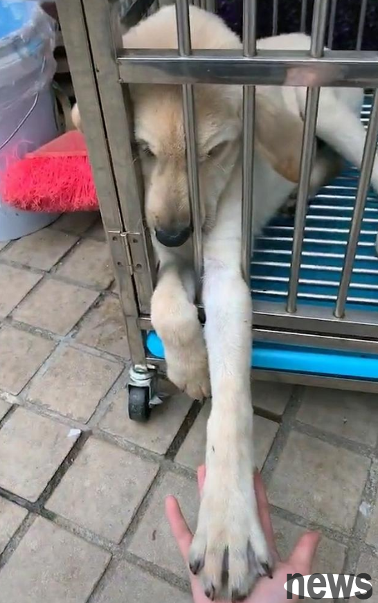 The Labrador suddenly stretched out a little paw from the gap in the cage! The poop scraper was so cute that he quickly held its furry paw and stroked it gently.