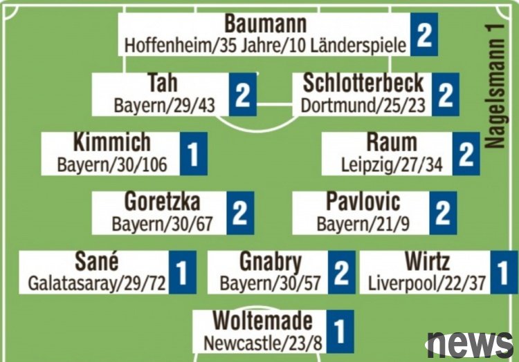 Midfielder: Goretzka (2), Pavlovich (2), Sane (1), Gnabry (2), Wirtz (1)
