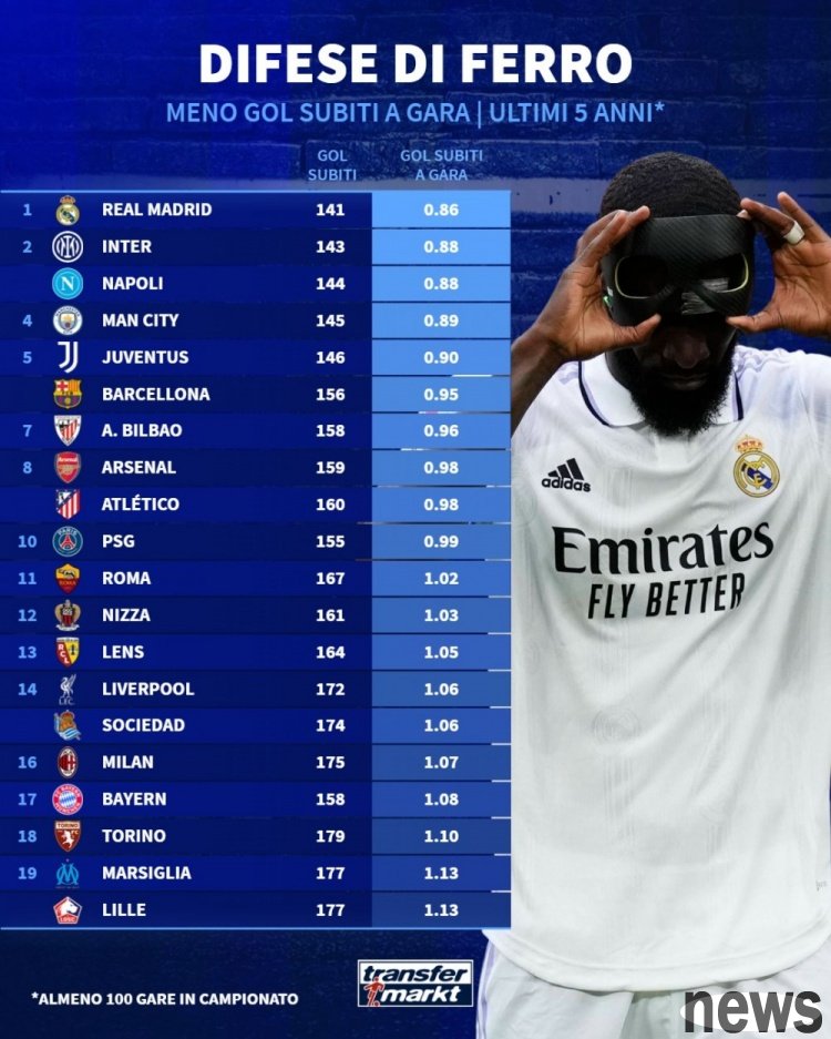 The German transfer market has counted the average goals conceded by teams in the five major leagues since the 2020-2021 season, and listed the list of the fewest goals conceded per game. Real Madrid ranked first with 0.86 goals, followed by Inter Milan and Naples.