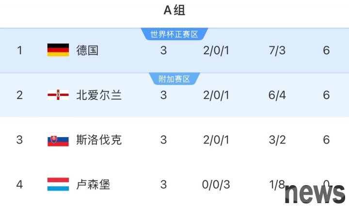 Group A Germany, Northern Ireland and Slovakia all have 2 wins and 1 loss, and the three teams have 6 points. Luxembourg has lost three games in a row and is at the bottom of the table.