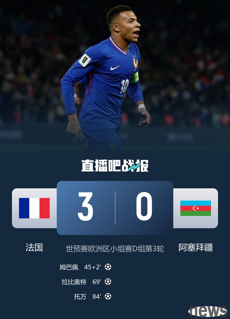 In the third round of Group D of the European Group Stage of the World Cup Qualifiers, France easily defeated Azerbaijan 3-0. Mbappe passed and shot, Rabiot and Thauvin scored.