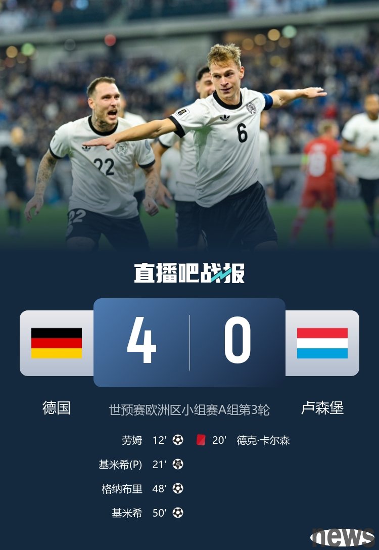 In the third round of Group A of the European Group Stage of the World Cup preliminaries, Germany defeated Luxembourg 4-0. Kimmich scored twice, Laum made a world wave, and Gnabry scored.