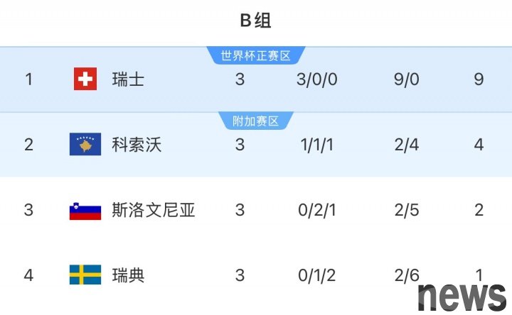 European World Preliminary Group B: Sweden has lost three games in a row and is at the bottom. Switzerland leads the way with three consecutive wins.