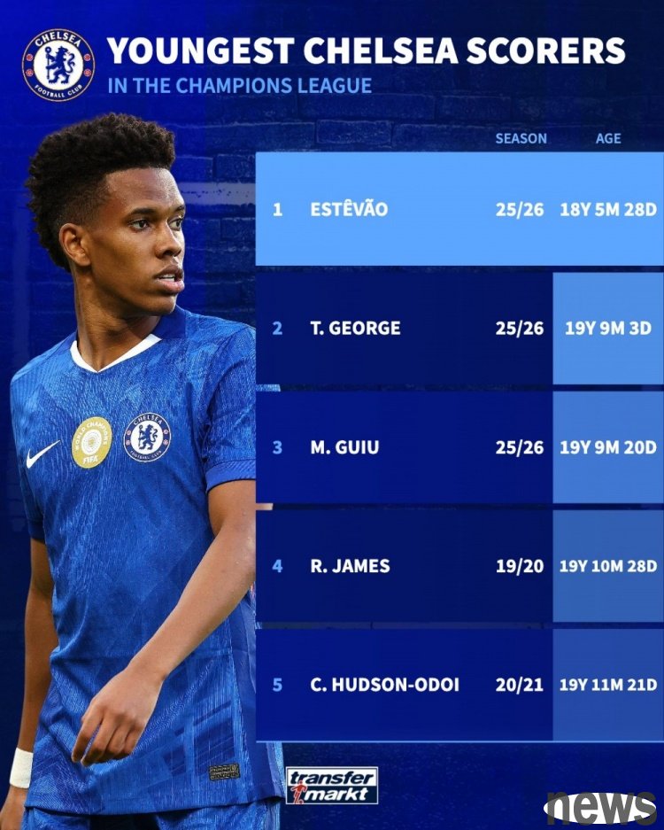 Ranking of Chelsea's youngest goalscorers in the Champions League: