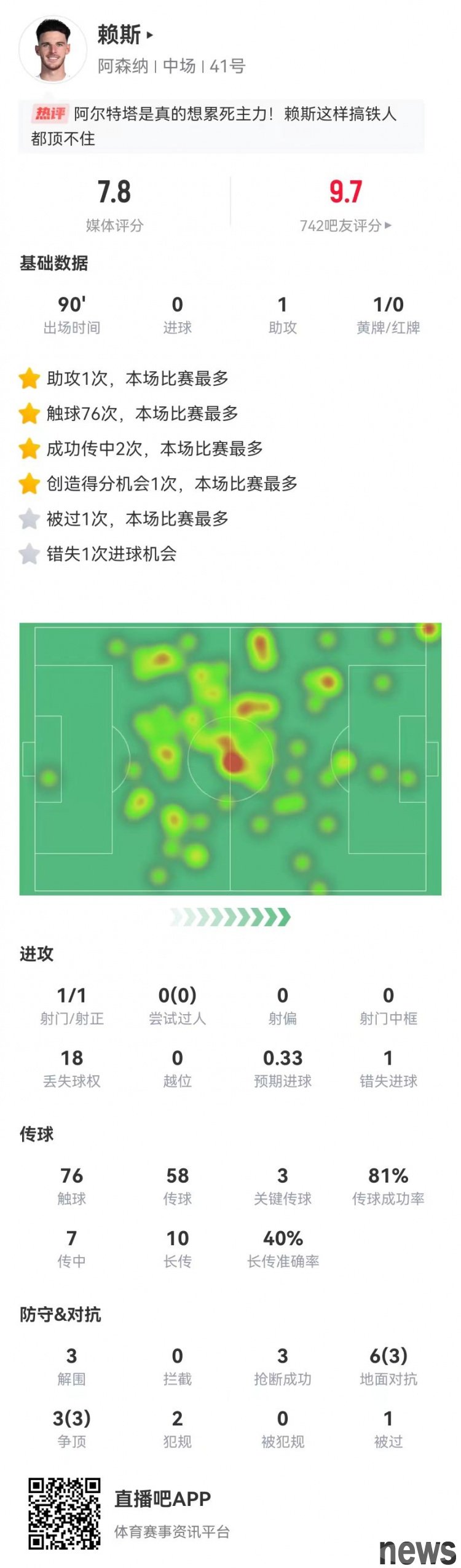 Arsenal defeated Tottenham 4-1 in this round of the Premier League. Rice's statistics for this game are as follows: