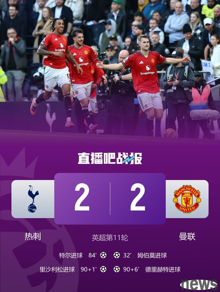 Mbemo scored the first goal in this game, and then Tottenham scored two goals in a row to overtake the score, and De Ligt scored a perfect tie. This is the same script as Manchester United's 2-2 draw with Nottingham Forest in the last round. Both were reversed after taking the lead and equalized at the last minute. According to statistics, this is the first time since Manchester City in 2012 that a team has had this situation in two consecutive rounds.