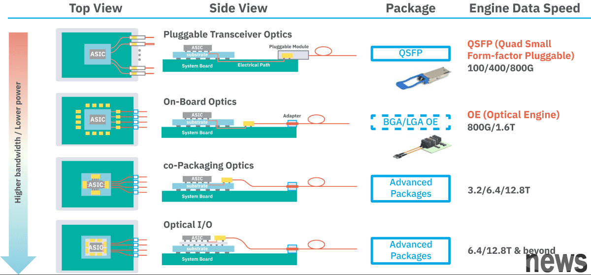 What is the relationship between optical transport modules, optical communications and silicon photons?From the first two diagrams below, we can see that the current pluggable optical receiver transmission rate on the market can reach 800G. The next stage optical engine (Optical Engine, simply OE) can be installed in the ASIC chip packaging area. This is called the board optical packaging (On-Board Optics, simply OBO), and its transmission capacity can support 1.6T.
