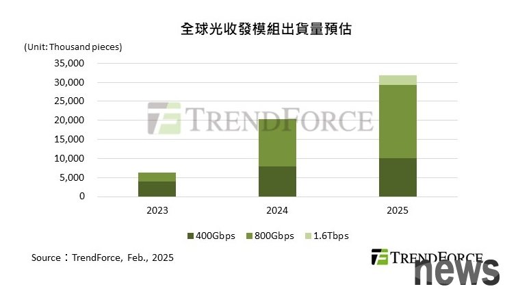 Market research organization TrendForce expects that the global shipment volume of optical harvest modules with a total of 400G or more in 2023 will be 6.4 million, about 20.4 million in 2024, and is expected to exceed 31.9 million by 2025, with an annual growth rate of 56.5%. Among them, the demand for AI servers continues to drive the growth of 800G and 1.6T, and traditional servers have also upgraded according to specifications, driving the demand for 400G optical transport modules.