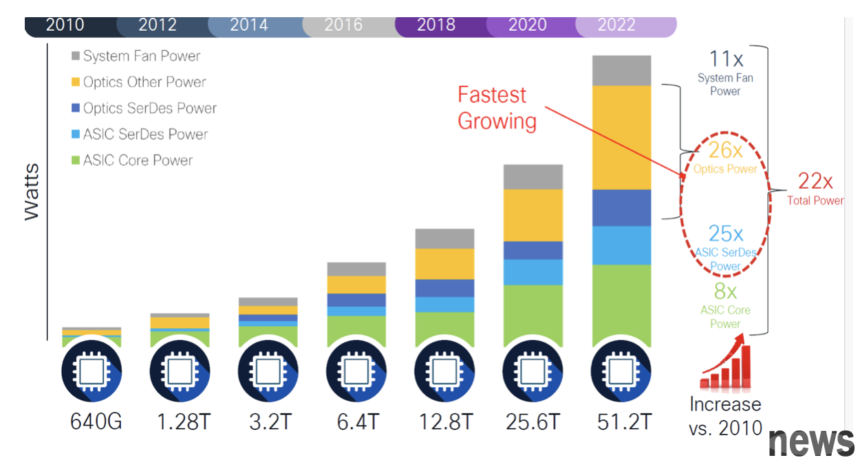 If you look carefully at the above map, you can find that the optical communication module (formerly pluggable) that is used as a yellow square is getting closer to the ASIC, mainly to shorten the transmission path of the signal and achieve a higher frequency width. Silicon photon processing technology is the technology of integrating optical components into chips.